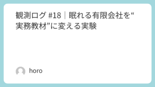 お金のこと 観測ログ #18|眠れる有限会社を“実務教材”に変える実験 8月18日(まえがき)義父の休眠会社を資産管理会社に再構築する計画を形にしてみた。ただ「会社を残す」だけでなく、診断士やITストラテジストの勉強を実務に結びつける最高の教材として活用できることに手応えを感じている。今日の思考整理は、休眠会社... 2025.08.22 お金のこと自己研鑽のこと