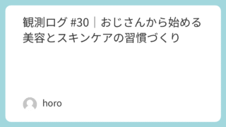 自己研鑽のこと 観測ログ #30|おじさんから始める美容とスキンケアの習慣づくり 8月30日(まえがき)気づけば30代半ば。記憶力も体力も、静かに下降線を描きつつある。ふとした瞬間に「あれ、顔が疲れているな」と思うことが増えた。寝不足の翌日のクマ、口元の乾燥、そして以前よりくっきり目立つ毛穴。20代の頃なら一晩寝ればリセ... 2025.09.01 自己研鑽のこと